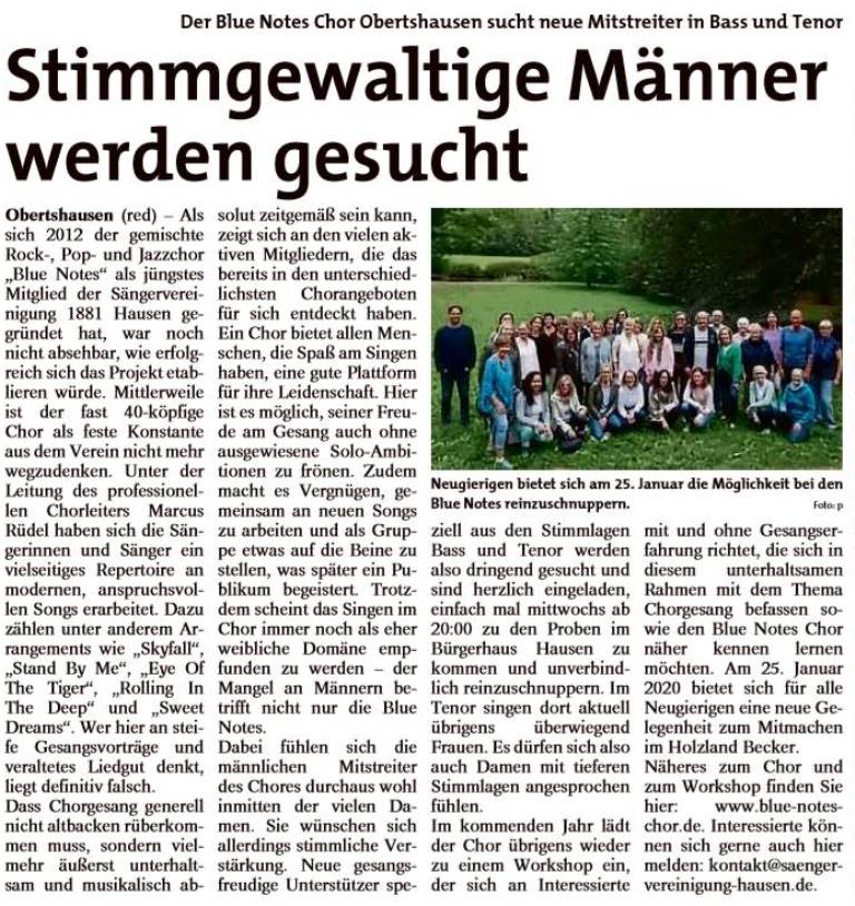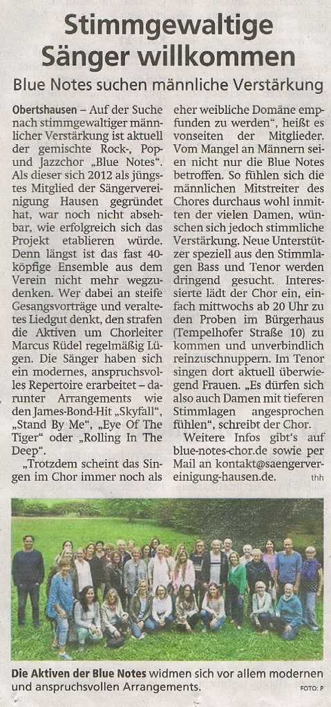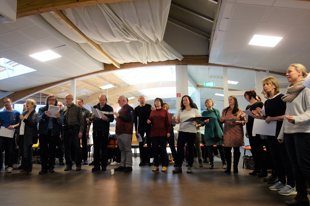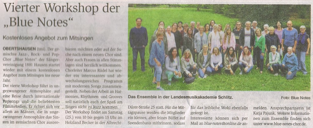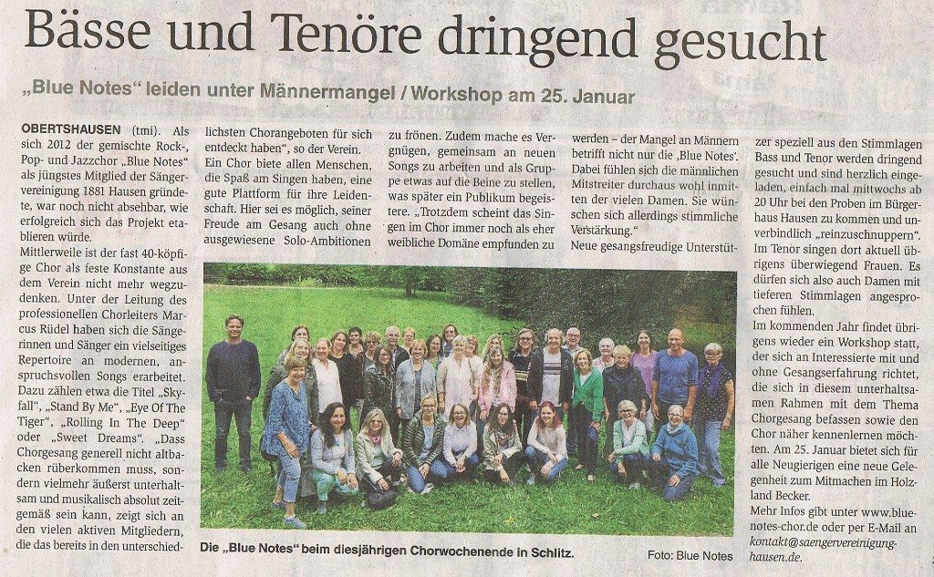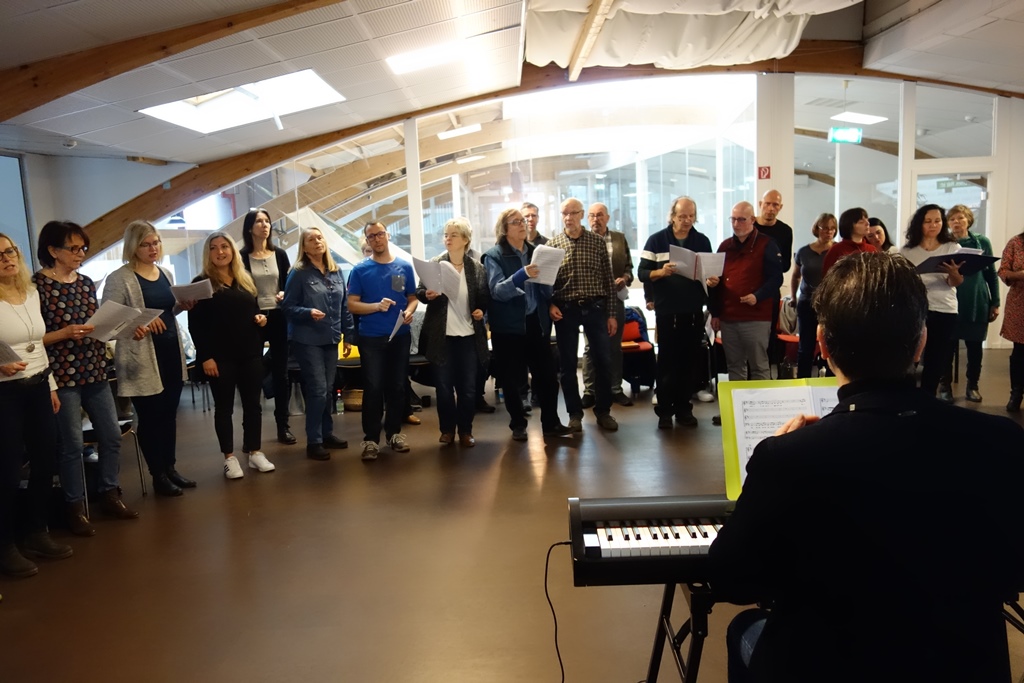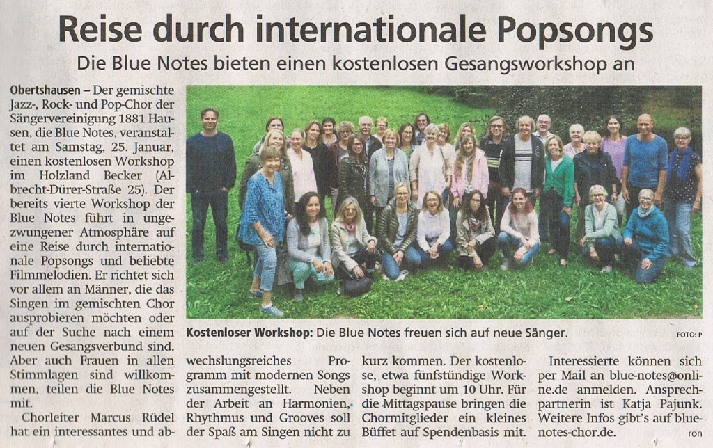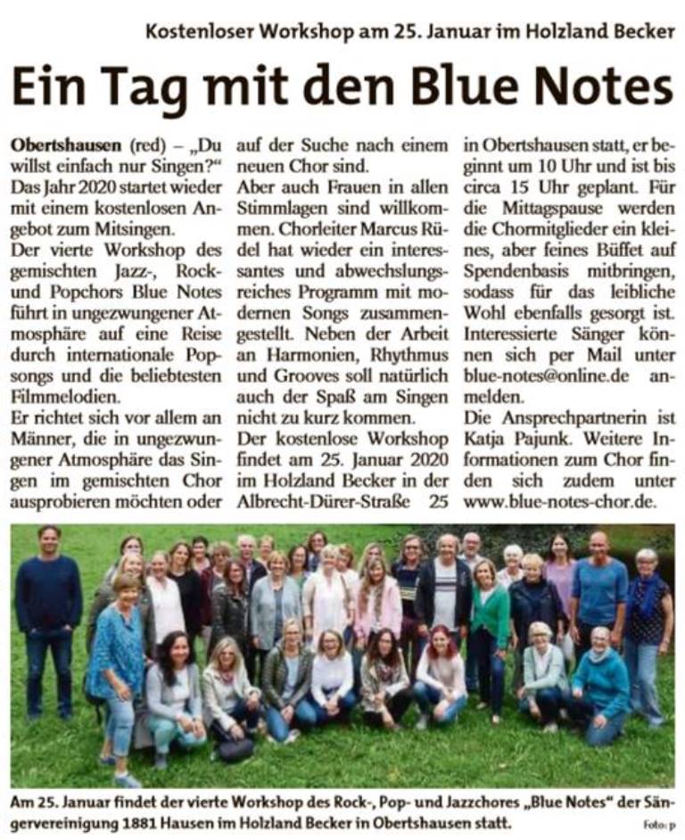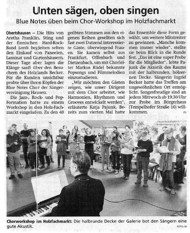 Mit der Aufforderung "Du willst einfach nur singen?" lud der Blue Notes Chor zum diesjährigen Workshop im Holzland Becker ein. 24 interessierte Sängerinnen und Sänger gesellten sich am Samstag, dem 25. Januar, zu den 36 Chormitgliedern. Auf dem Programm standen eingängige Popstücke wie "Don't stop believin'" in der Glee-Version und "Stand by me" von Ben E. King, aber auch Soul wie etwa "Respect" von Aretha Franklin. Den rockigen Abschluss bildeten "We will rock you" von Queen und das Rock'n'roll-Medley "Shake, rattle and rock". Die Teilnehmer und Teilnehmerinnen waren mit Begeisterung dabei. Einige der "Neuen", die eigentlich nur zum Schnuppern gekommen waren, sagten spontan zu, zur nächsten Chorprobe der Blue Notes zu kommen.