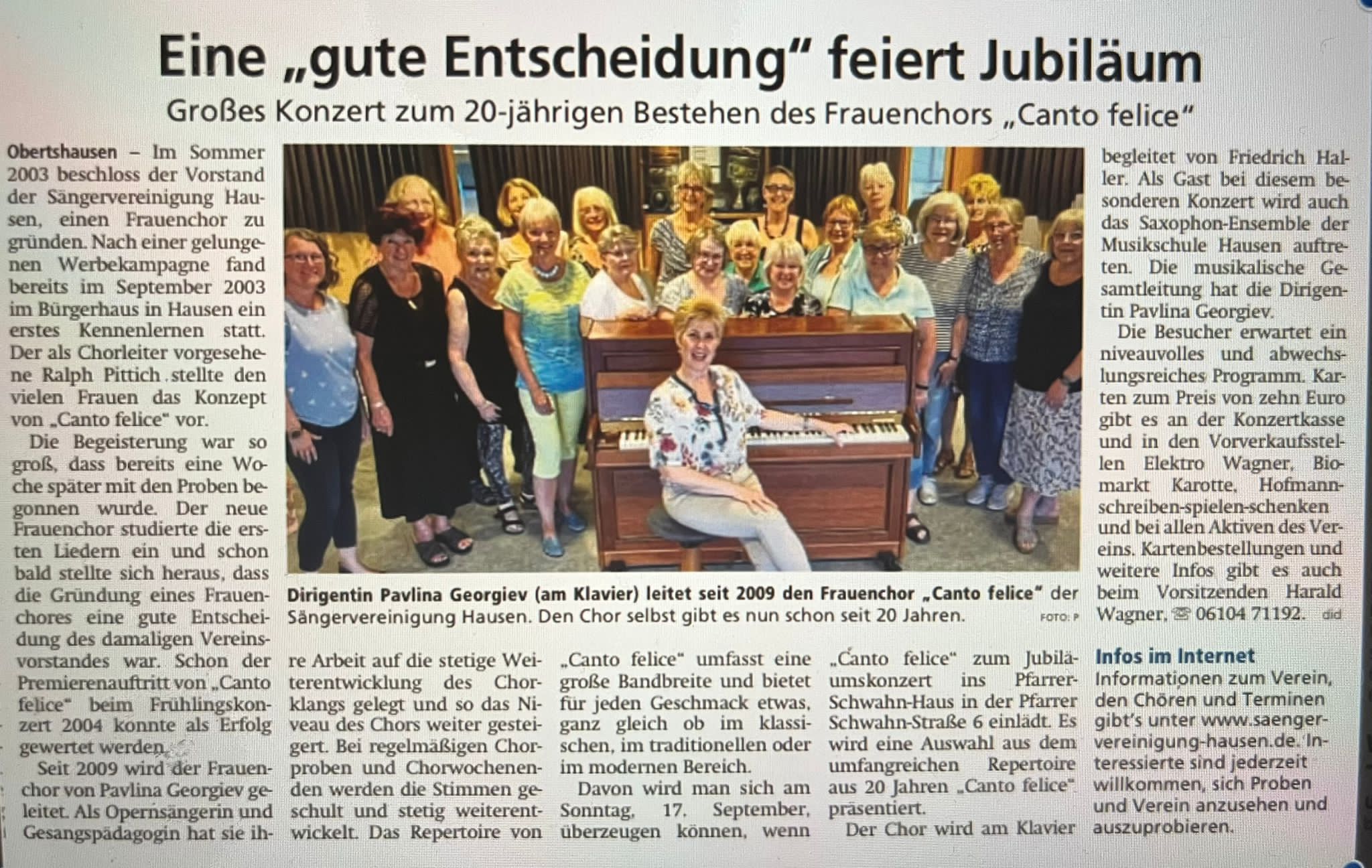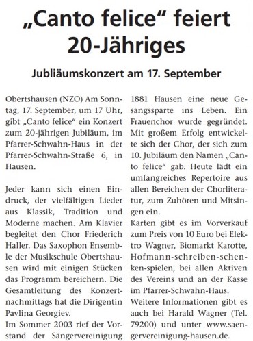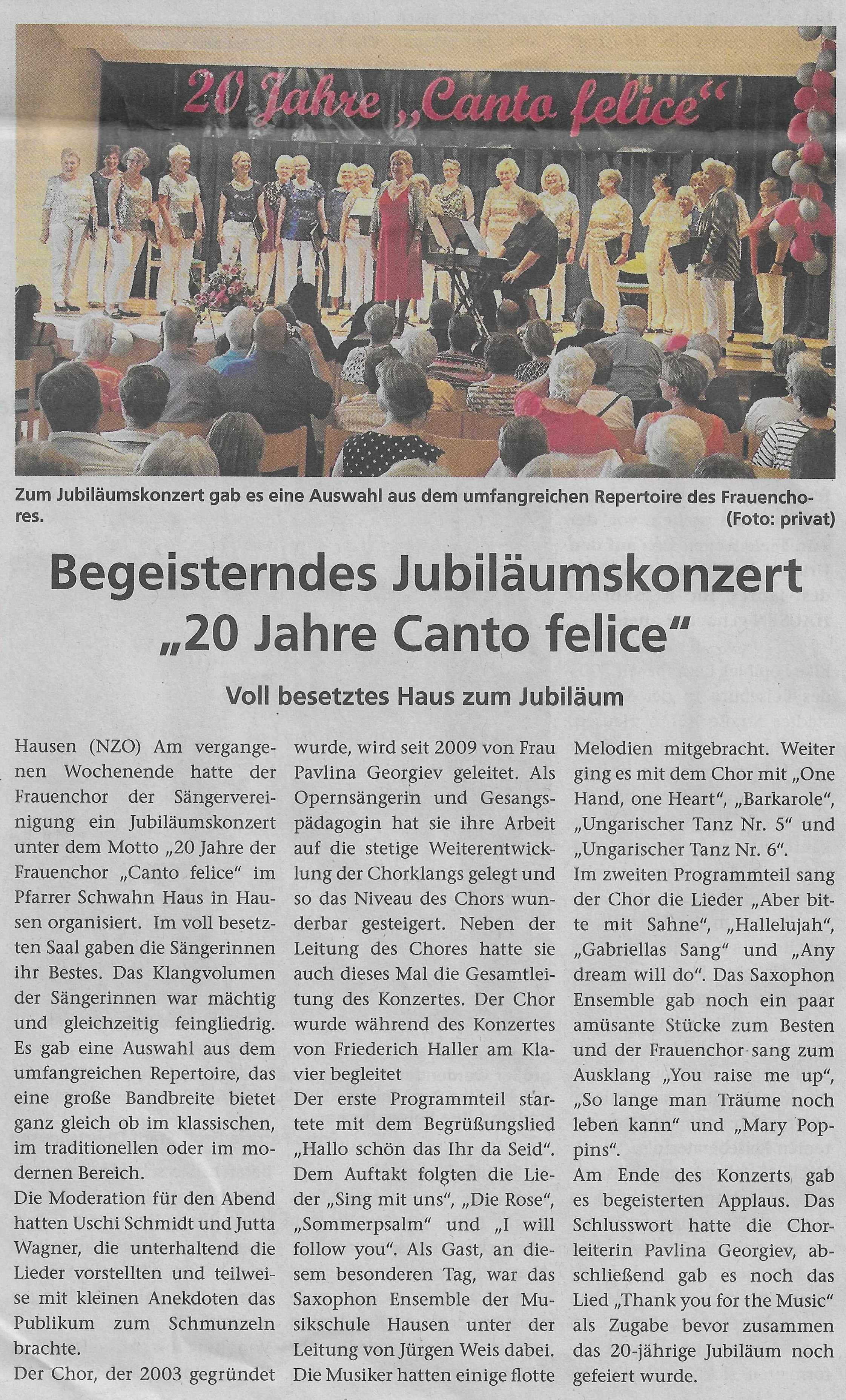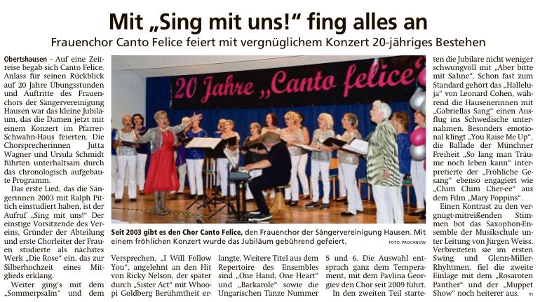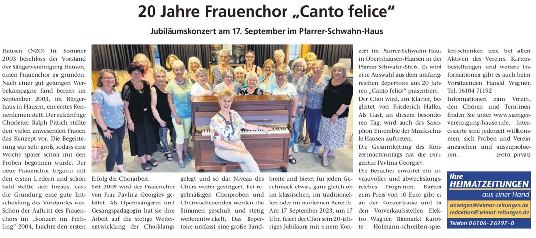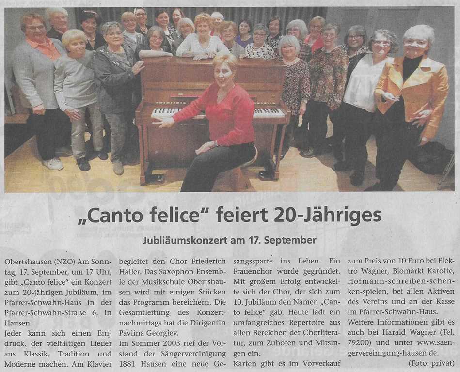 Der Frauenchor der Sängervereinigung hatte unter dem Motto „20 Jahre der Frauenchor „Canto felice“ im Pfarrer Schwahn Haus in Hausen ein Jubiläumskonzert organisiert. Im voll besetzten Saal gaben die Sängerinnen ihr Bestes. Das Klangvolumen der Sängerinnen war mächtig und gleichzeitig feingliedrig. Es gab eine Auswahl aus dem umfangreichen Repertoire.
