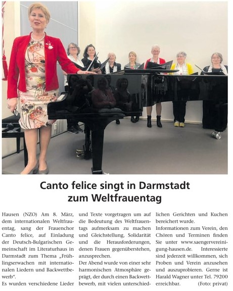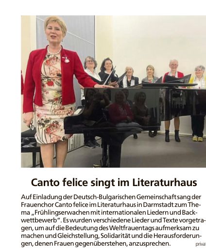 Im Literaturaus Darmstadt gab es eine Veranstaltung der Deutsch Bulgarischen Gesellschaft. Ein kleiner Kreis des Frauenchores Canto felice hatte eine musikalische Darbietung zum Thema "Frühlingserwachen mit internationalen Liedern und Backwettbewerb"