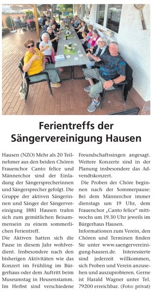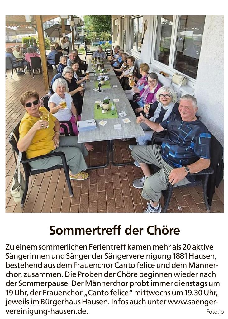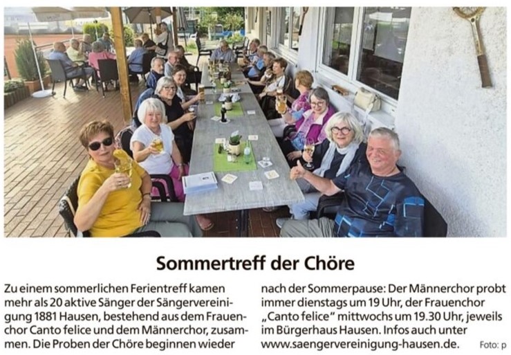 Mehr als 20 Teilnehmer aus den beiden Chören Frauenchor Canto felice und Männerchor sind der Einladung der Sängersprecherinnen und Sängersprecher gefolgt. Die Gruppe der aktiven Sängerinnen und Sänger der Sängervereinigung 1881 Hausen trafen sich zum gemütlichen Beisammensein zu einem sommerlichen Ferientreff.