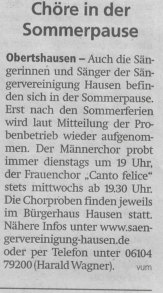 Die Aktiven hatten sich die Pause in diesem Jahr wohlverdient. Insbesondere nach den bisherigen Aktivitäten wie das Konzert im Frühling im Bürgerhaus oder dem Auftritt beim Museumstag in Heusenstamm. Im Herbst sind verschiedene Freundschaftssingen angesagt. Weitere Konzerte sind in der Planung insbesondere das Advendtskonzert.