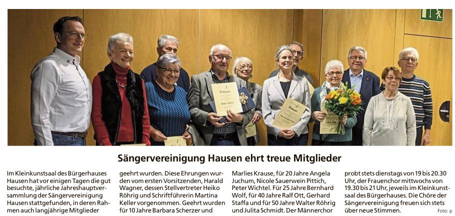 Die Chorproben des Männerchores finden jeden Dienstag von 19:00 Uhr bis 20:30 Uhr im Kleinkunstsaal des Bürgerhauses Hausen statt.